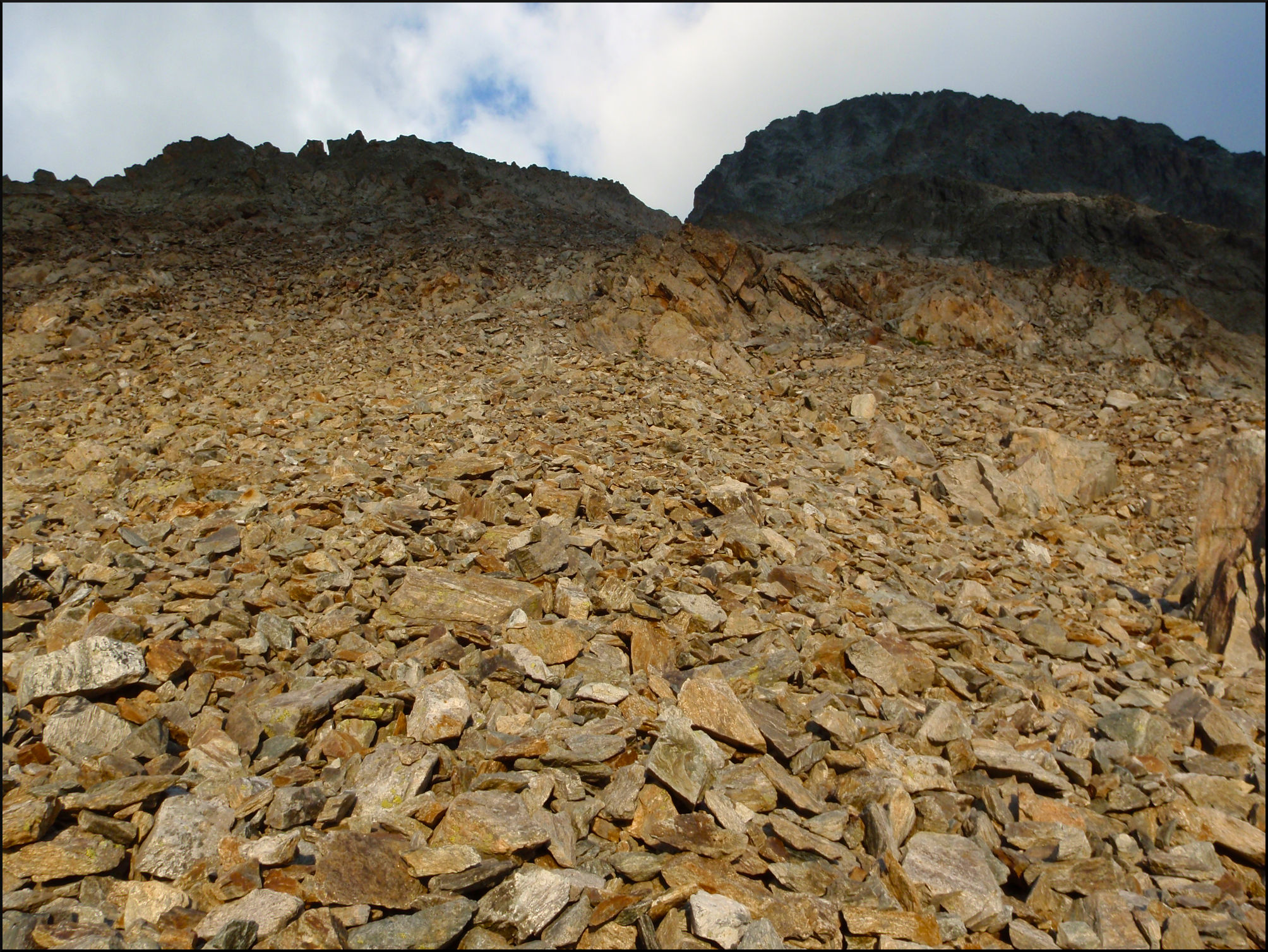 Après la brèche commence la portion pénible. Il s'agit de contourner par la droite un ressaut de l'arête par des pentes qui sont enneigées en début de saison mais qui sont plus tard constituées dans un terrain morainique raide et instable fait de gros blocs de rocher enchâssés dans la terre. Une cordée totalement débutante dans sa première année d'alpinisme ne sera pas du tout à son aise dans un terrain pareil.